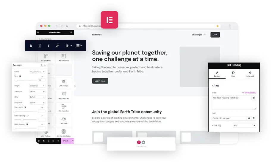 Explore a collection of unique, ready-made website demos to kickstart your design journey. Import any design with one click, and easily align it with your branding using global fonts and colour settings. Start customizing with the Elementor page builder and update the content effortlessly.